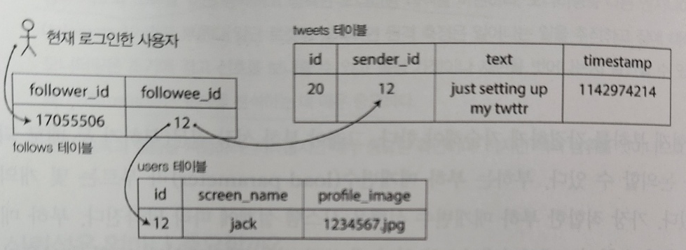 - 버전1 : 트윗을 쓰면 테이블에 전역적으로 insert. 각 유저는 타임라인 접근 시점에 join